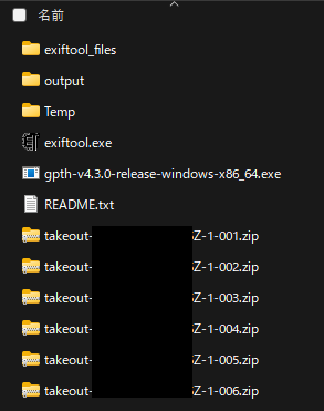 Google Photos からダウンロードしたzipファイルを格納しているフォルダに、これまでダウンロードした以下の2つのファイル群を移動しましょう。